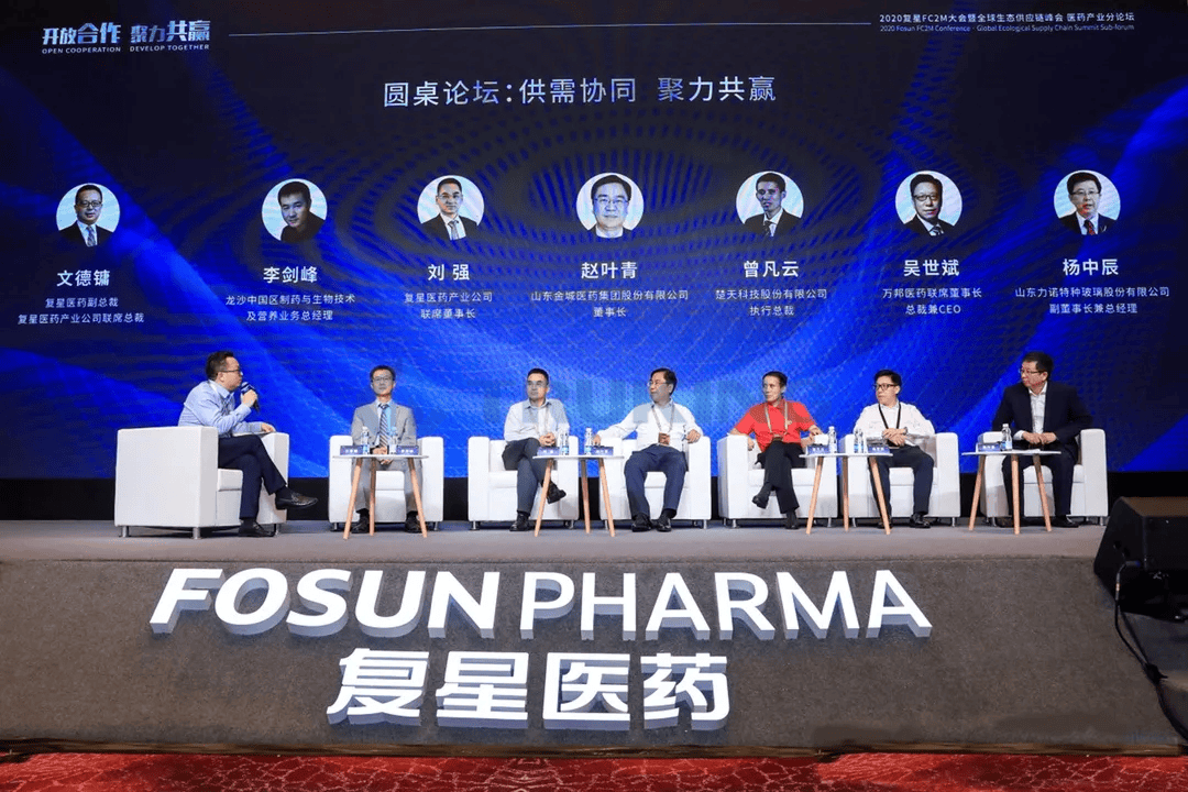 9月7日上午,以“拓展全球,生态共赢”为主题的复星全球生态供应链峰会举行主论坛,当天下午举行峰会医药产业分论坛。在峰会医药产业分论坛上,复星医药副总裁、复星医药产业公司联席总裁文德镛主持“供需协同,聚力共赢”主题圆桌对话,复星医药产业公司董事长刘强,万邦医药联席董事长、总裁兼CEO吴世斌,以及楚天科技执行总裁曾凡云等与会嘉宾应邀参加圆桌论坛对话。